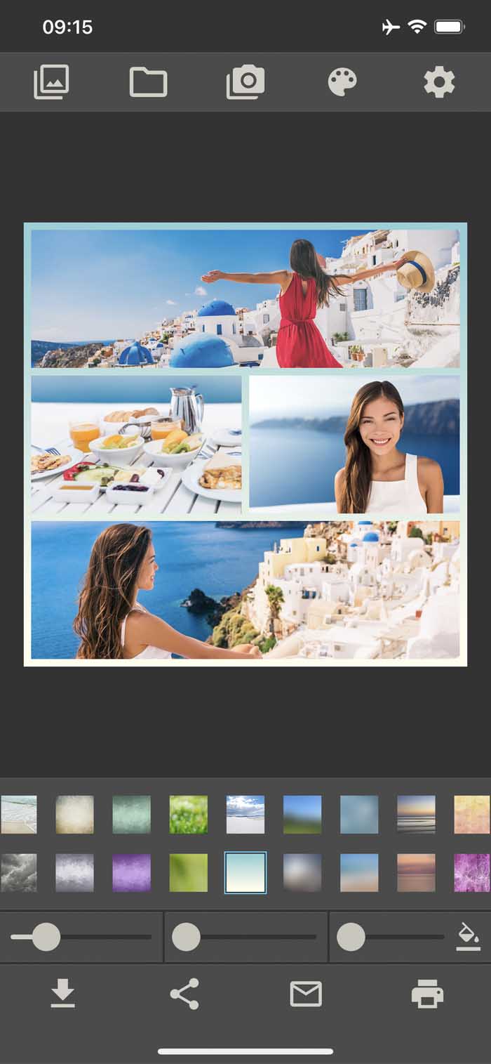 Cette application de collage vous permet d'enregistrer l'image finale, de l'envoyer par e-mail, de l'imprimer ou de la partager avec d'autres personnes.